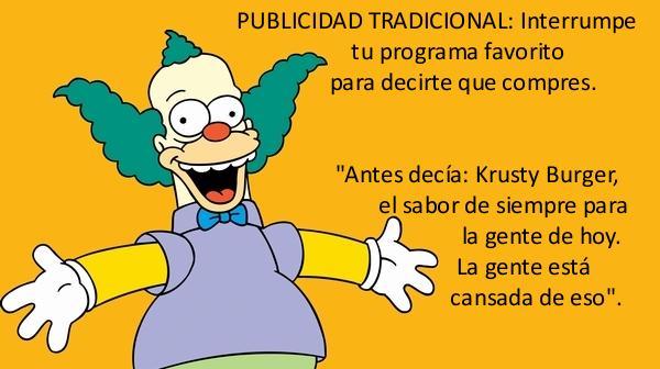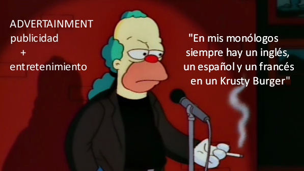 «El advertainment mezcla de advertising (publicidad) y entertainment (entretenimiento). Otros dicen branded content; es lo mismo«, dice Krusty. Le pido ejemplos. «En mis monólogos para adultos siempre hay un inglés, un español y un francés en un Krusty Burger. Quiero que la gente piense que Krusty Burger es una marca divertida».