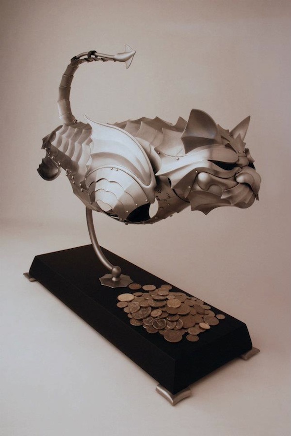 «Todo empezó mientras estaba estudiando joyería en el Alberta College of Art and Design. Para una clase de escultura hice una especie de armadura para un gato. Durante años el tema de las armaduras me había interesado mucho e incluso, durante los años 80, había construido 7 armaduras para personas en el taller de metal de mi familia. El resultado de aquel trabajo no me dejó satisfecho y pensé si sería posible hacer otra armadura para gato, pero utilizando los mismos materiales con los que había construido mis anteriores armaduras. Además, en el taller de la escuela de joyería tenía todos los materiales y máquinas necesarios para construir una pequeña armadura. Así fue como hice mi primera armadura para gatos”.