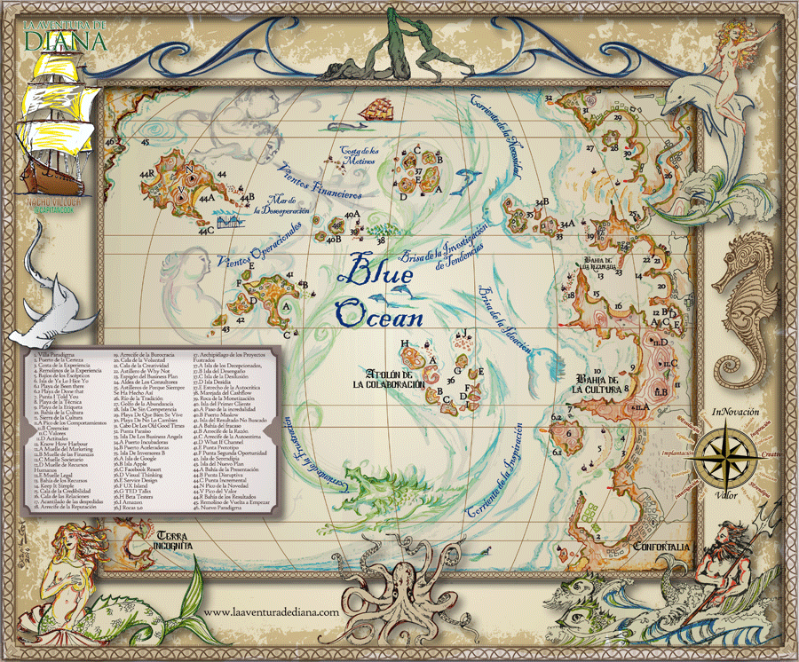 Nacho Villoch pintó en este mapa las coordenadas de la innovación. Quería situar en una carta náutica lo que siempre ocurre cuando alguien busca una fórmula nueva. Definió los paisajes agradables y los lugares hostiles. Y les dio un nombre. Los llamó Atolón de la colaboración, Bahía de los recursos, Know How Harbour, Punta I Told You, Arrecife de la reputación, Astillero de Why Not o Mar de la desesperación.