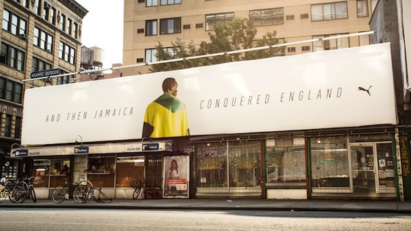 Lo fácil hubiera sido aprovecharse del tirón para lanzar mensajes grandilocuentes. Ir a lo deliberadamente comercial para vender más. Pero la compañía parece haber optado por un mensaje más sosegado tras el climax de los juegos. Puma lo celebra con este sencillo y bello cartel que muestra a Usain Bolt de espaldas cubierto con la bandera jamaicana.