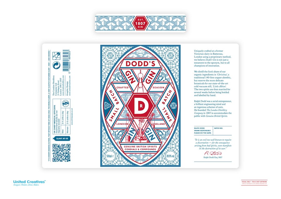 Cuando United Creatives recibió un encargó para diseñar el etiquetado de una nueva ginebra llamada Dodd’s Gin, lo fácil hubiera sido recurrir a imágenes de barriles y plantas. Por suerte contaban con un referente inspirador para hacerlo de otra manera. La nueva marca de la London Distillery Company coge el nombre de su fundador Ralph Dodd, un ingeniero que decidió combinar su trabajo de proyectar edificios con la de elaborar una ginebra a principios del siglo XIX. (Indagando un poco en su historia es conocido por haber intentado sin éxito construir un túnel debajo del Támesis).