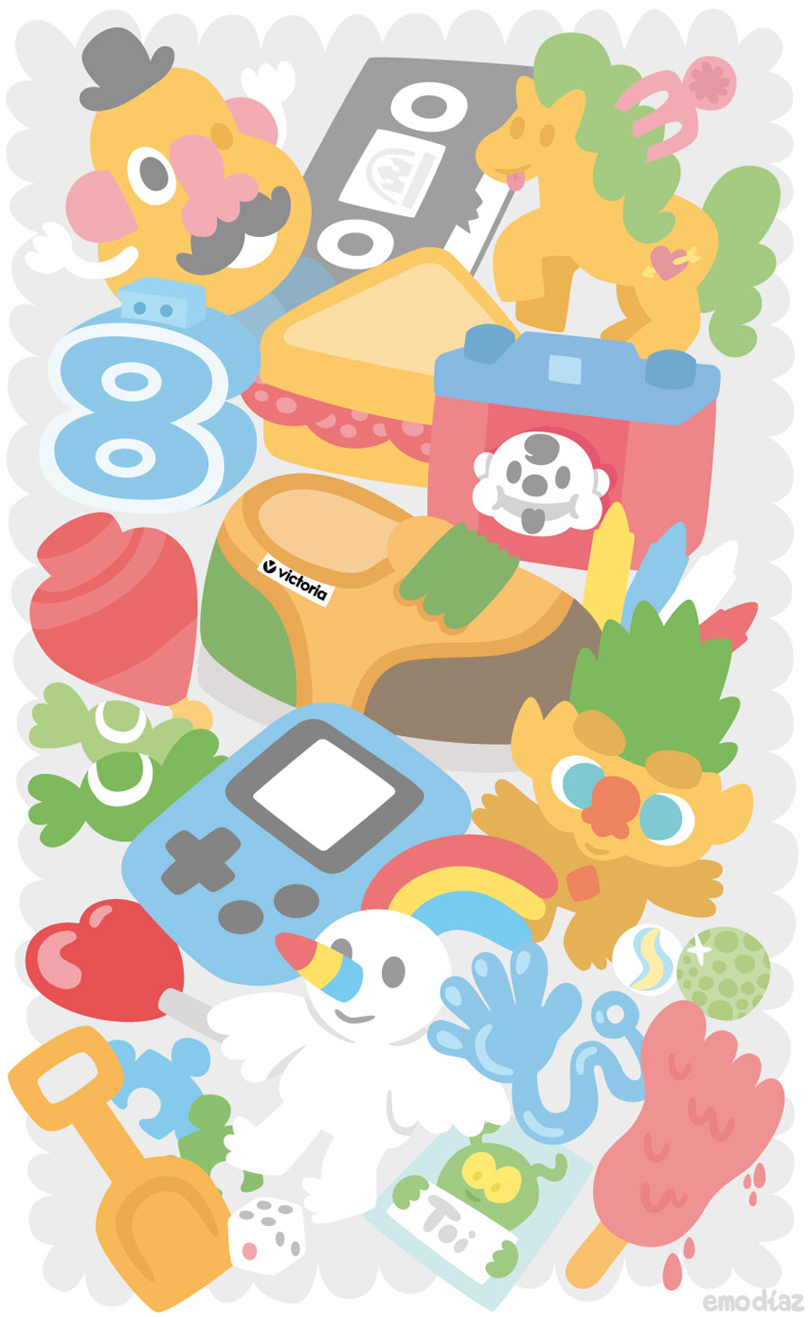 No tienes que pringarte de plastilina, pintar las paredes blancas de pintura azul o quedarte en la cama mientras gritas que no quieres ir al cole. Lo que el dibujo de Emo Díaz nos propone es un viaje al pasado, a esos años en los que nos ilusionábamos con todo y hasta una caja de cartón servía como nave espacial, casa de té o simplemente para escondernos y darle un susto a un familiar.