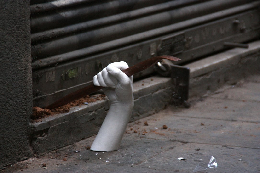 A finales de noviembre un viandante se acerca a una entidad bancaria en Barcelona a sacar dinero de un cajero. En la fachada se encuentra con un puño cerrado que agarra una soga pegado a la pared. Son imágenes duras cargadas de simbolismo en estos tiempos convulsos.