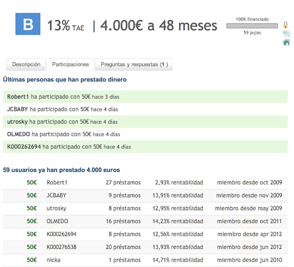 Los préstamos en grupo significan que en un préstamo cualquiera pueden participar decenas de personas. En la imagen aquí debajo se muestra una petición de financiación de un particular calificado en el perfil B. En él han participado 59 personas que entre todos aportan un total de 4.000 euros. La mayor parte pone entre 50 y 100 euros pero una de las personas llegó a aportar 500. (El máximo es 1.000 euros por prestamista).