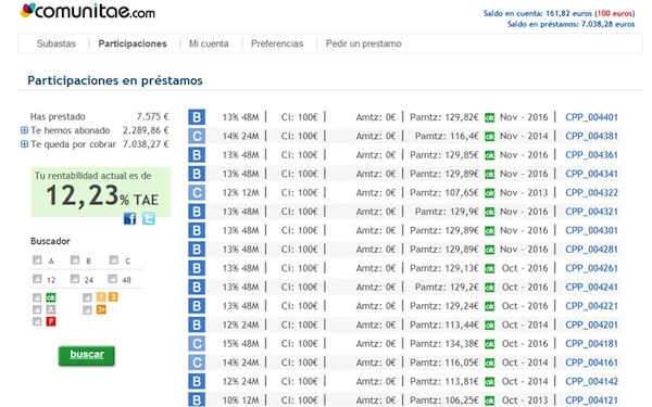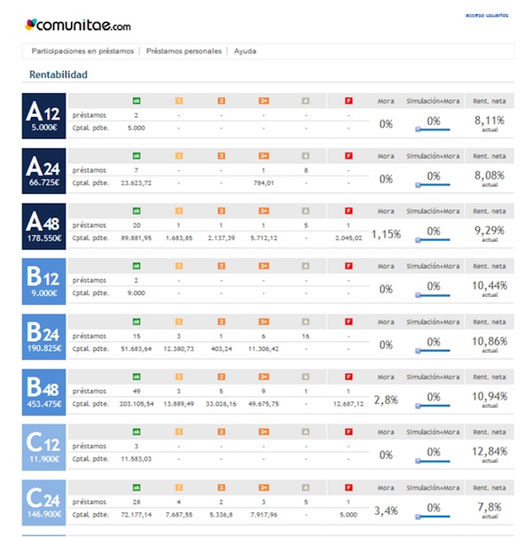 Actualmente los préstamos que se otorgan oscilan entre 1.000 y 12.000 euros y el interés que paga el prestatario depende de la solvencia de la persona que la solicita y que Comunitae se encarga de establecer. “Lo dividimos en tres categorías: A, B o C”. Los préstamos se dan en un plazo de 12, 24 y 48 meses y los intereses varían entre un 8% y un 15%, según el perfil del prestatario. «La media es de un 12%, una cifra equiparable a la de muchos bancos».