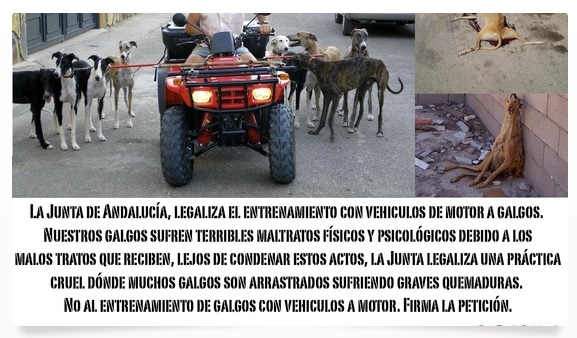 La historia comprimida: La Junta de Andalucía pretende autorizar el entrenamiento de galgos con vehículos a motor. Se legalizaría así lo que hasta el momento es considerado un delito según la legislación de protección de animales. A partir de ahora, según el borrador, los propietarios de galgos podrán atarlos con una cuerda a un “ciclomotor, motocicleta, quad o análogos” para entrenarlos a partir de los seis meses de edad.
