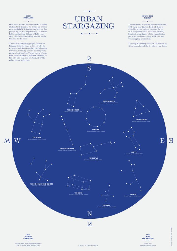 El artista francés Oscar Lhermitte llevaba cinco años viviendo en Londres cuando se dio cuenta de que la única constelación que había sido capaz de ver en todo ese tiempo era la Osa Mayor. Nuestros ojos son capaces de avistar casi todas las estrellas en días despejados, pero el mismo entorno urbano que nos conecta a un mundo tecnológico nos aleja a la vez de nuestra propia naturaleza. Entonces decidió recrear parte de esas constelaciones e inventar algunas nuevas para, en torno a ellas, construir una nueva mitología de la ciudad en la que se encuentren.
