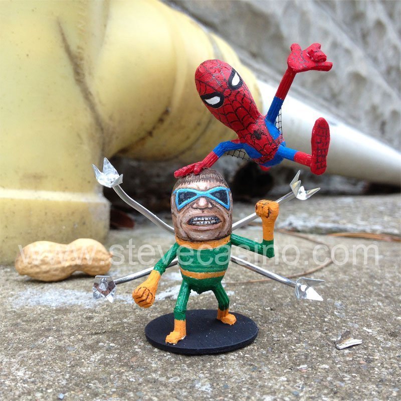 Un artista estadounidense ha encontrado un nuevo uso para los humildes cacahuetes: convertirlos en pequeñas figuras de personajes conocidos. Steve Casino se define en su vídeo de presentación como un «pintor de cacahuetes» que un día se dio cuenta de que estos frutos secos tenían una forma similar a la de su cuerpo. Su primer prototipo fue una figura de Joey Ramone, experiencia que usó para perfeccionar el proceso. «Intento hacer cacahuetes de gente que admiro», dice.