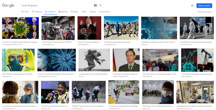 Si hacemos una búsqueda simple en el apartado de imágenes de Google (covid-19 y guerra), en primer lugar aparecen algunos políticos y militares junto a fotografías de científicos y médicos.