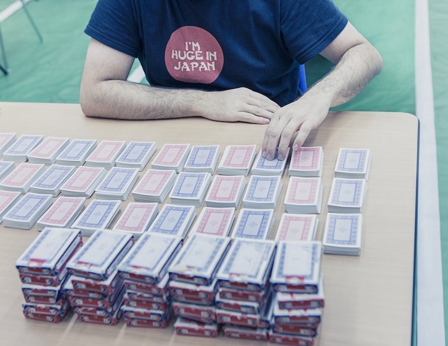 “1, 7, 6, 2, 9, 3“, y así sucesivamente hasta llegar a 400 números. Una voz grave lee estos dígitos en orden aleatorio mientras los participantes en la sala escuchan concentrados. Una vez terminado el tiempo, tienen 20 minutos para escribirlos en un papel en el orden exacto que ha sido dictado, sin ningún tipo de ayuda externa. Los concursantes recurren a distintos procedimientos para aumentar su concentración. Algunos usan gafas oscuras que reducen a la mínima expresión cualquier tipo distracción en su horizonte visual. Los protectores de oídos también proliferan en la sala para bloquear el sonido ambiental. Son herramientas utilizadas para facilitar el reto mental titánico que supone almacena r semejante cantidad de información en sus cabezas.