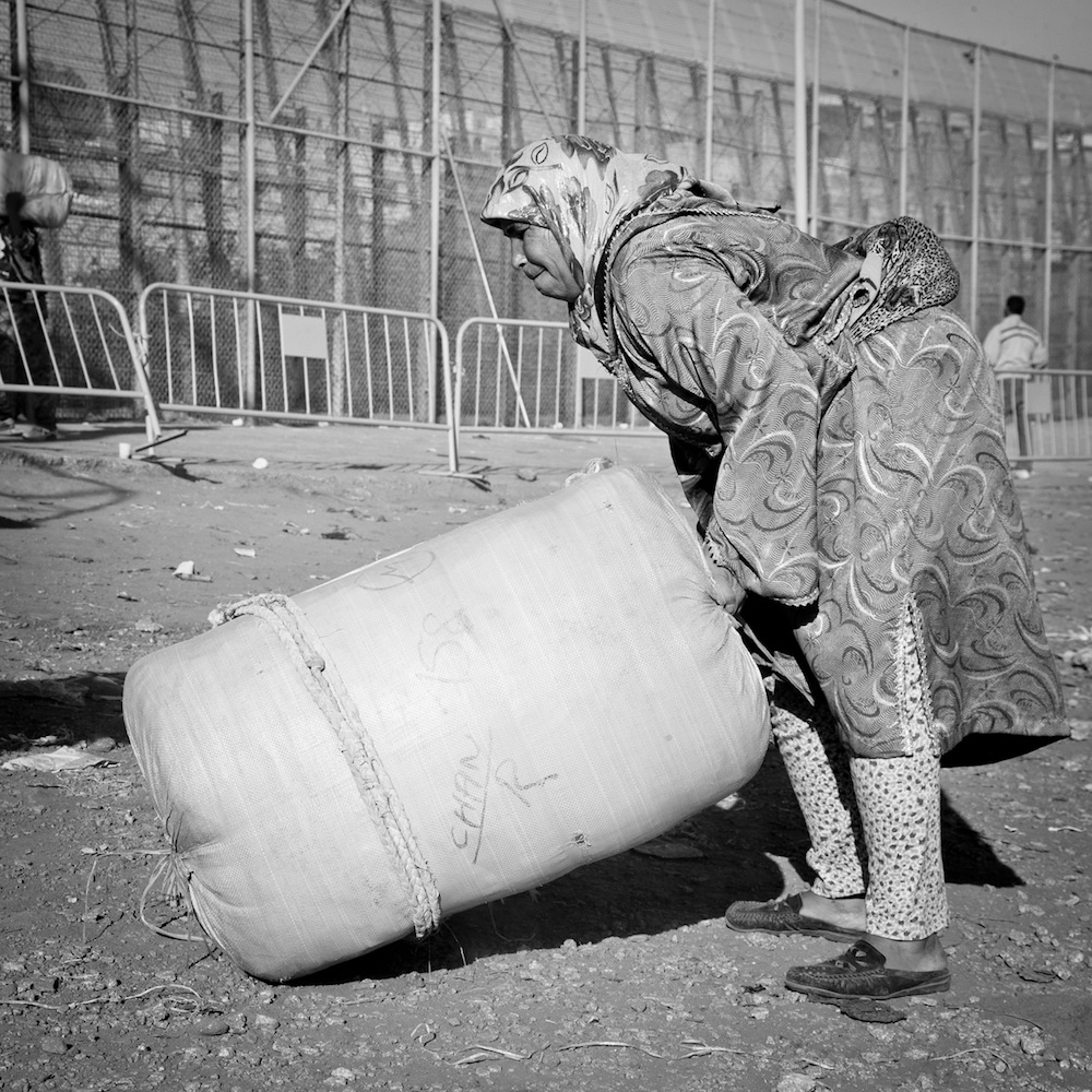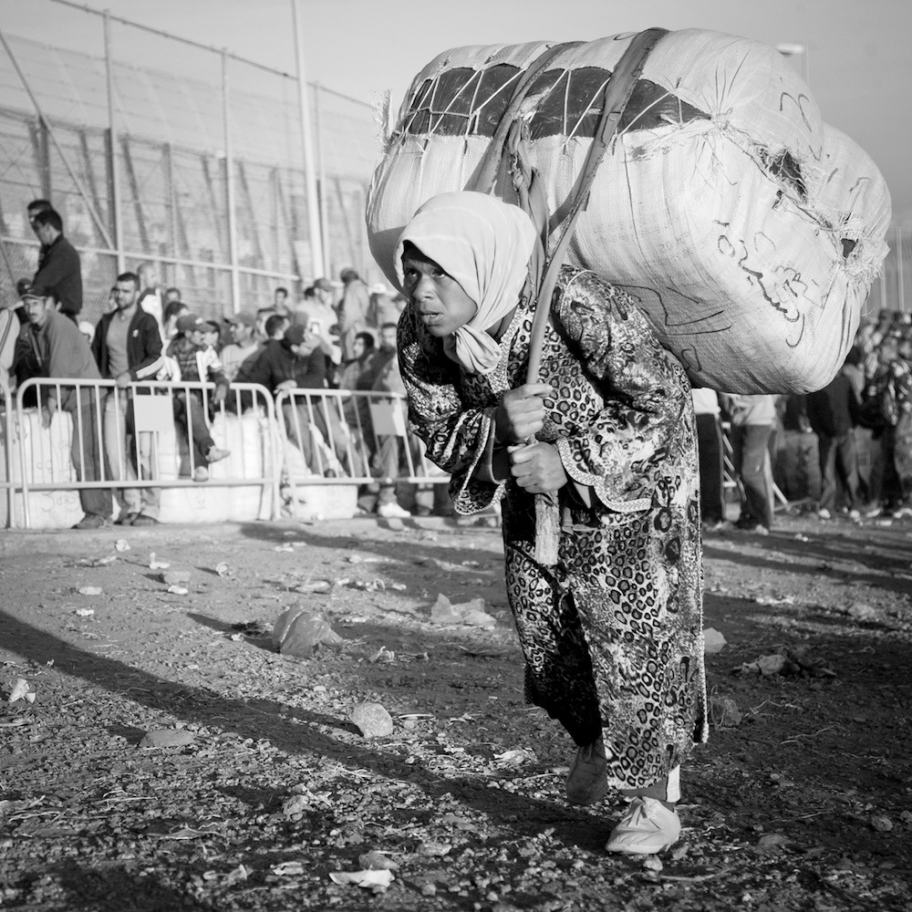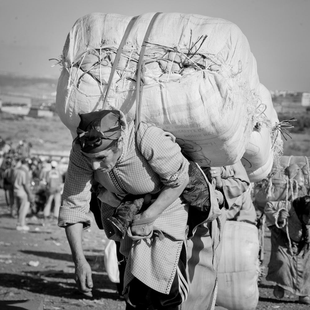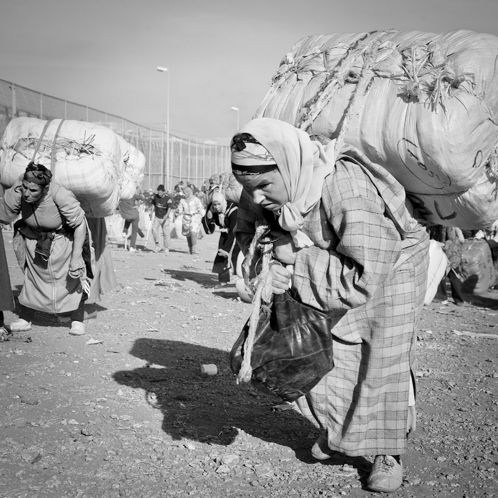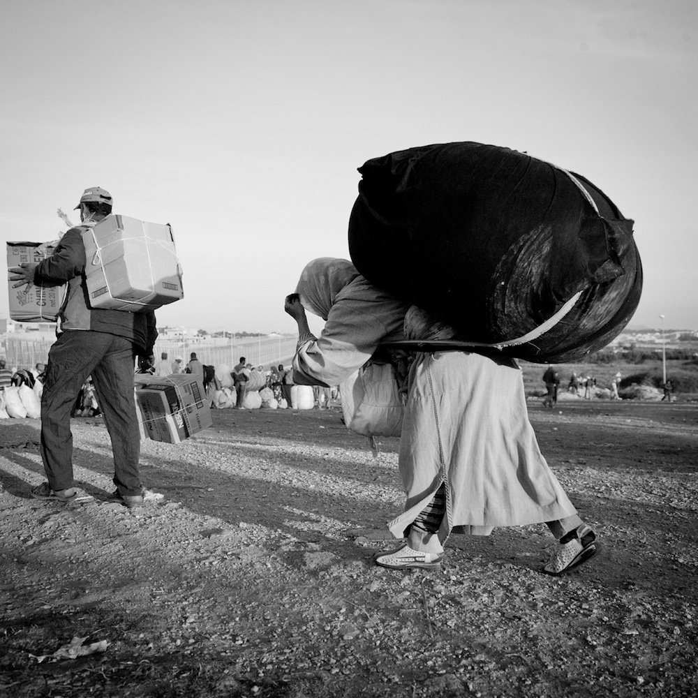 Es así como cada día, de lunes a jueves, miles de porteadores marroquíes cruzan a pie la frontera cargados con enormes bultos de hasta 80 kg. de peso. La mayoría son mujeres de todas las condiciones: jóvenes, mayores, abuelas, discapacitadas o con muletas. Algunas, con estudios. Otras, sin formación alguna. Muchas aparentan ser ancianas sin llegar a los 40 años. Entre gritos, empujones y peleas, y recibiendo hasta palos a veces de los policías, las porteadoras, también llamadas “esclavos de la frontera“, cargadas como mulas, transportan o empujan fardos que pesan más que ellas.