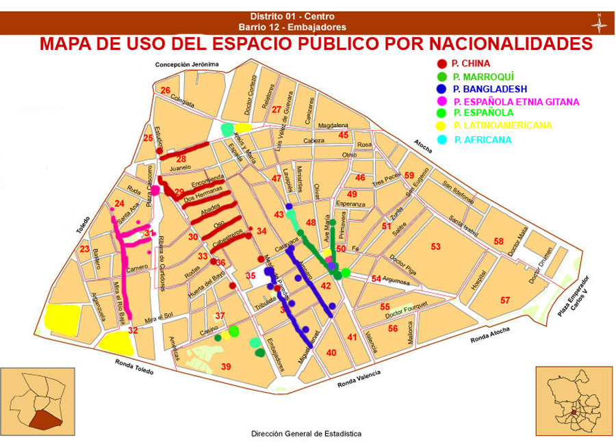 En concreto, la mayoría de los ‘banglash’ viven en la calle Amparo y alrededores. Y es que, Lavapiés, a su modo, es un mundo dentro del mundo. El mapa del barrio muestra que cada comunidad vive, trabaja y socializa en zonas concretas del barrio. Y apenas se mezclan. Los chinos controlan las calles del norte, donde han instalado sus tiendas de venta al por mayor. Este tipo de tiendas llegó a ser casi monopolio en Lavapiés, con el desembarco en los años 90 de la comunidad china. “El presidente de la asociación de comerciantes chinos –explica Manuel– me preguntó si quería que Lavapiés fuera ‘chinatown”. Manuel contiene una sonrisa. “Yo le dije que sí, que quería que esto fuera ‘chinatown’, ‘senegaltown’ y ‘marruecostown’. Aquí cabemos todos”. Con los años los comerciantes chinos han ido desplazando sus negocios a polígonos industriales como Cobo Calleja –conocido despectivamente como Cobo Chineja–, donde dominan absolutamente el mercado.