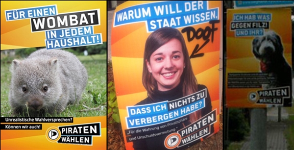 Prueba de su actual irrelevancia es que su gran momento en la campaña ha sido gracias a que interrumpieron un mitin de Merkel con un avión teledirigido. De corte social-liberal, sus propuestas tienen que ver con los derechos a la información, la privacidad , el acceso a internet y los derechos de autor. Sus carteles electorales se caracterizan por estar protagonizados por posadolescentes e incluso perros y su intención de voto para este domingo pasa ligeramente el 3%.