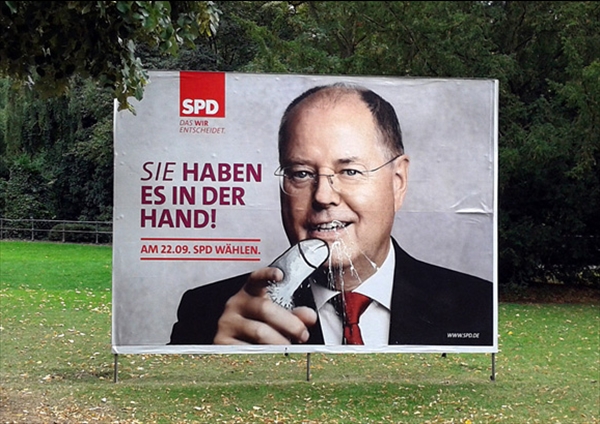 Lenguaraz, Steinbrück ha dado bastante chicha a los comicios. Desde decir que Merkel parte con ventaja por ser mujer hasta los comentarios sobre sus elevados emolumentos por dar charlas (25.000 euros) para luego pedir un aumento de sueldo para los parlamentarios, la culminación gráfica ha sido levantar el dedo corazón como respuesta a los que le apodan Peerlusconi en una entrevista gestual. El jefe de su partido, Sigmar Gabriel, le ha mostrado su menosprecio varias veces y en su propio partido hay muchas voces contra él. El semanario Der Spiegel lo resumió en junio pasado como «El SPD está en modo autodestrucción«.