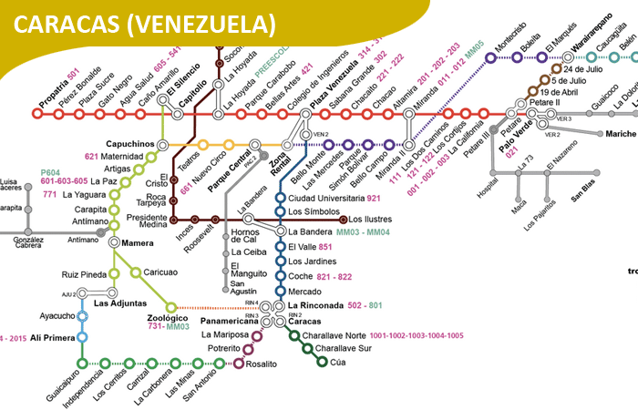 La representación esquemática llega a extemos con larguísimas líneas irreales, como si toda la ciudad fuera una recta, como sucede con Caracas. En ese caso, o en el de Teherán, las páginas web de sus Metros van encabezadas con la imagen de los líderes de los países -Chávez y Maduro en un caso, Jomeini y Rohani, lo que también dice mucho de los lugares en cuestión.
