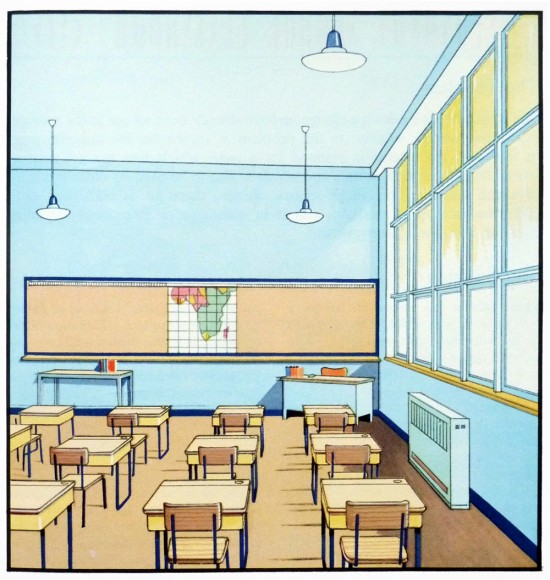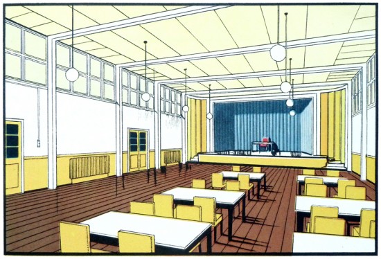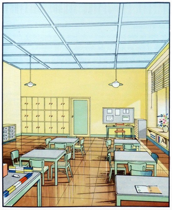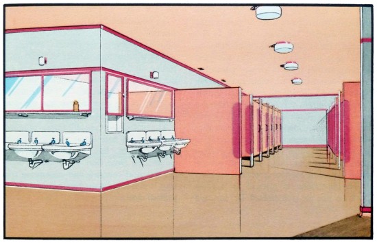 Llama la atención lo coloridos que son. Los espacios están llenos de luz y se aprecia amplitud por todas partes. Elaborarlas a mano aporta una calidez difícil de emular con las simulaciones actuales. «Están extraídas de un libro que encontramos en Dorset llamado The function of colour in factories, schools & hospitals, que explora el uso del color en estos espacios», explica Neal, responsable de Present & Correct.