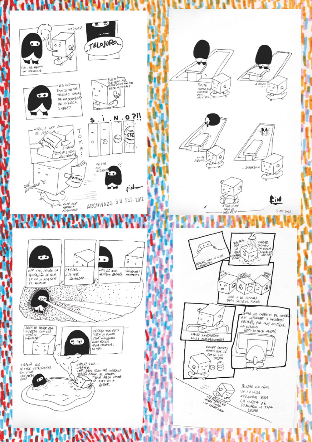 Estas criaturas protagonizan varias historias del fanzine titulado Mierda es, diseñado y escrito, en su totalidad, por Hugo Sierra. “Me divertía dibujar a estos personajes y contar sus historias personales. El cubo busca a gente normal e intenta hacer lo que le gusta: skate”, dice el autor. El glande, en cambio, tiene dudas existenciales. No es feliz en la Tierra y desea escapar a otro mundo.