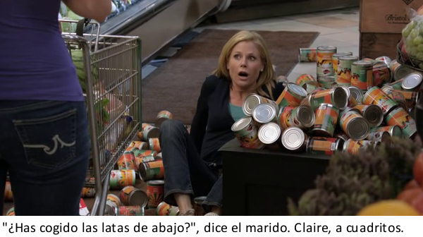 En el supermercado, Phil tontea con una jovencita, y empuja el carrito haciendo caer a Claire sobre un montón de latas, justo cuando intentaba colocarse un zapato. Cuando Phil cuenta la historia a los hijos, Claire parece tan culpable del accidente como estúpida. Claire rebate a su marido.