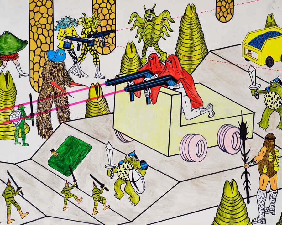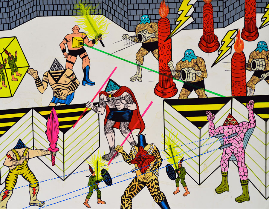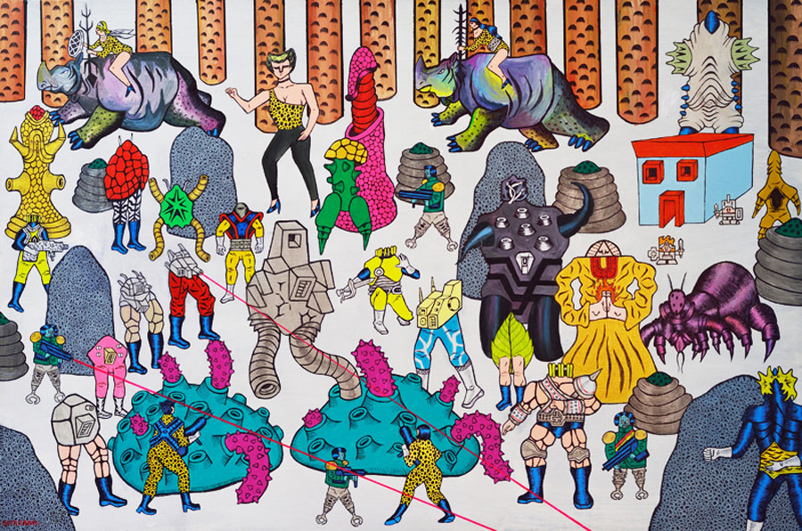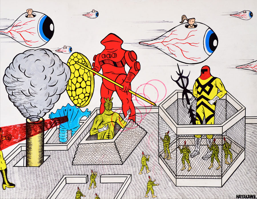 Esas legiones surgidas de lo más profundo de su imaginación habitan sus dibujos. Las criaturas de Hayakawaa despliegan contiendas inundadas de rayos pop y tiros láser de trazo de regla hasta que la lucha sale del papel para “hacer estallar nuestro mundo en pedazos”. Así lo siente Manuel Donada y por eso ha traído la obra de Hayakawaa a su galería, Watdafac (Madrid).