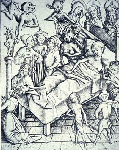 La religión católica creó el ritual de un final en la cama. El lecho de muerte era el lugar donde se concedía el perdón al moribundo por los errores de su vida. De lo humano pasaban después a lo divino. El sacerdote daba la extremaunción al enfermo y ya podía morir en paz.