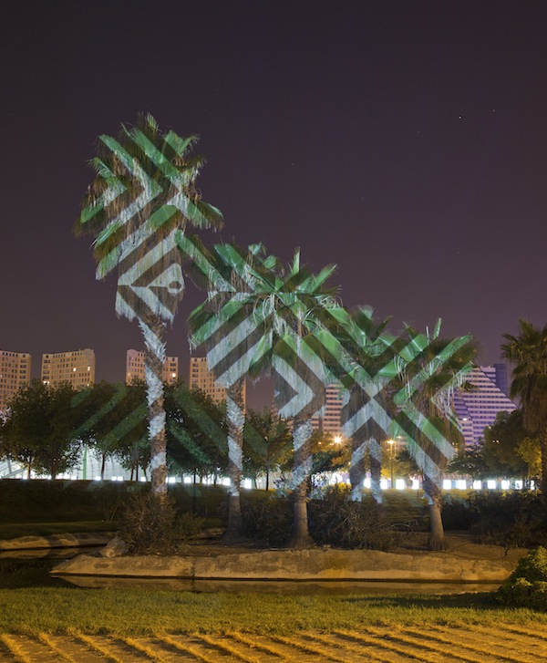 Once proyecciones de luz transforman este espacio abierto en un lienzo gigante. “Cada dibujo ha sido preparado específicamente para el lugar en el que está, buscando una adecuación entre la vegetación, compuesta por una gran variedad de especies autóctonas, y las geometrías proyectadas”, explica Riera.