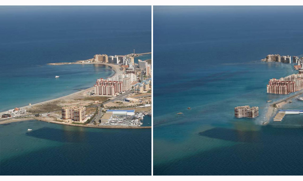 España es uno de los países más expuestos a la subida de las aguas, según Greenpeace. Un libro [.pdf] bastante controvertido publicado por la organización ecologista en 2008 presentaba unos impactantes (y algo sensacionalistas) montajes en los que 20 kilómetros de la Manga del Mar Menor, en Murcia, (des)aparecían, anegados por el Mediterráneo. Los hoteleros de la zona montaron en cólera claro: ¿y es que a quién se le ocurriría comprar un apartamento en primera línea bajo el nivel del mar?
