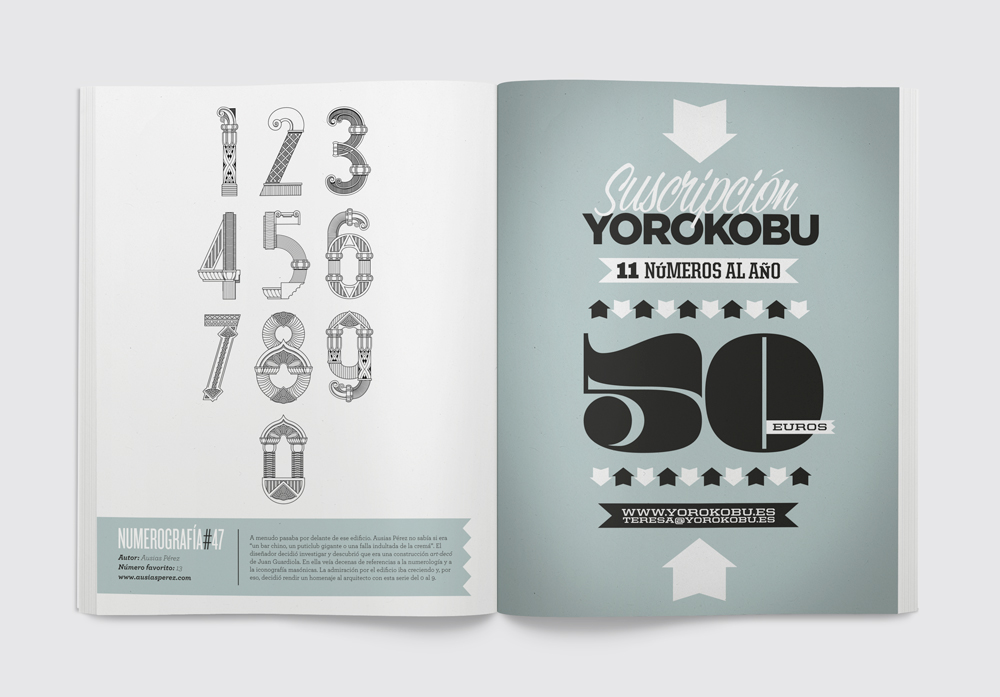 A menudo pasaba por delante de ese edificio. Ausias Pérez no sabía si era “un bar chino, un puticlub gigante o una falla indultada de la cremá”. El diseñador decidió investigar y descubrió que era una construcción art-decó de Juan Guardiola. En ella veía decenas de referencias a la numerología y a la iconografía masónicas. La admiración por el edificio valenciano iba creciendo y, por eso, decidió rendir un homenaje al arquitecto con esta serie del 0 al 9 publicada en la revista de enero de Yorokobu.