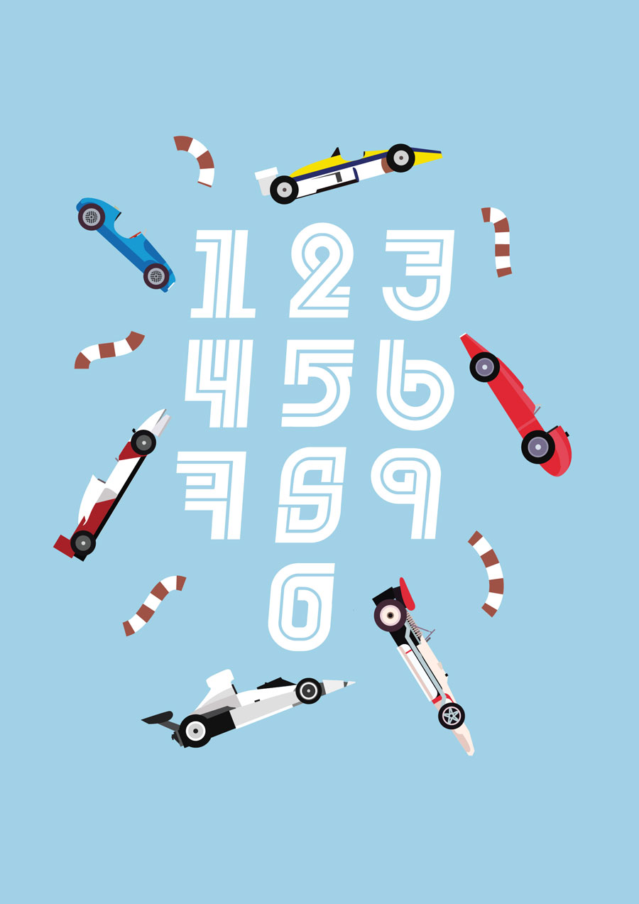 Estos dígitos arrancan de una pista. Parten de la parrilla de salida de Fórmula 1. En ese lugar los números son imprescindibles, según Pablo Gámez y Martha Gómez. Por eso se trasladaron hasta allí mentalmente al diseñar esta numerografía para la revista de diciembre de Yorokobu.