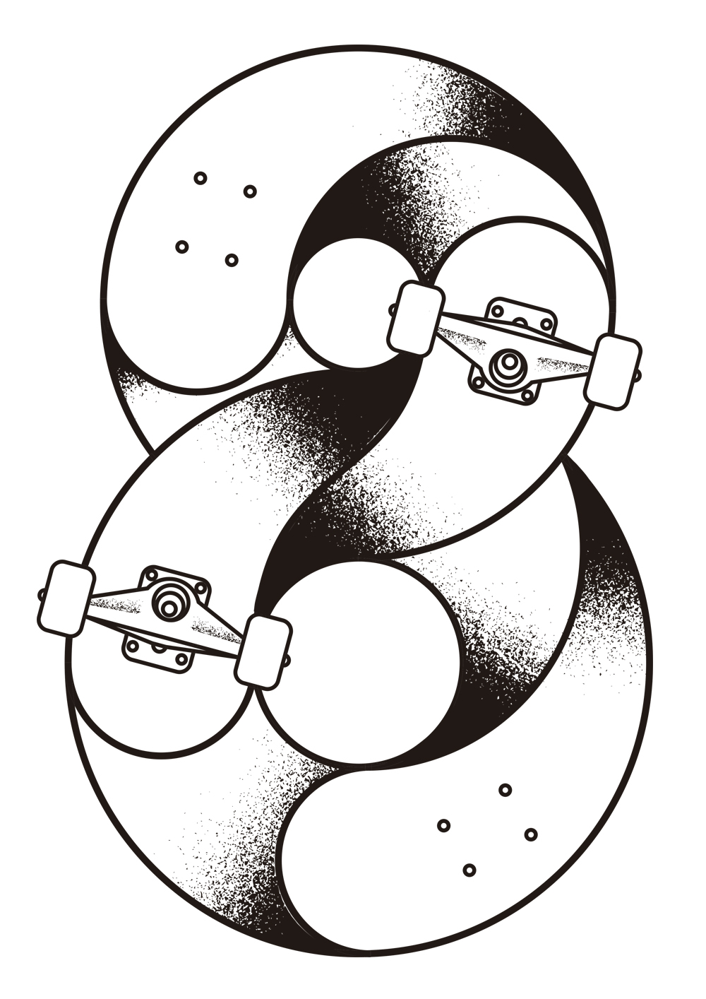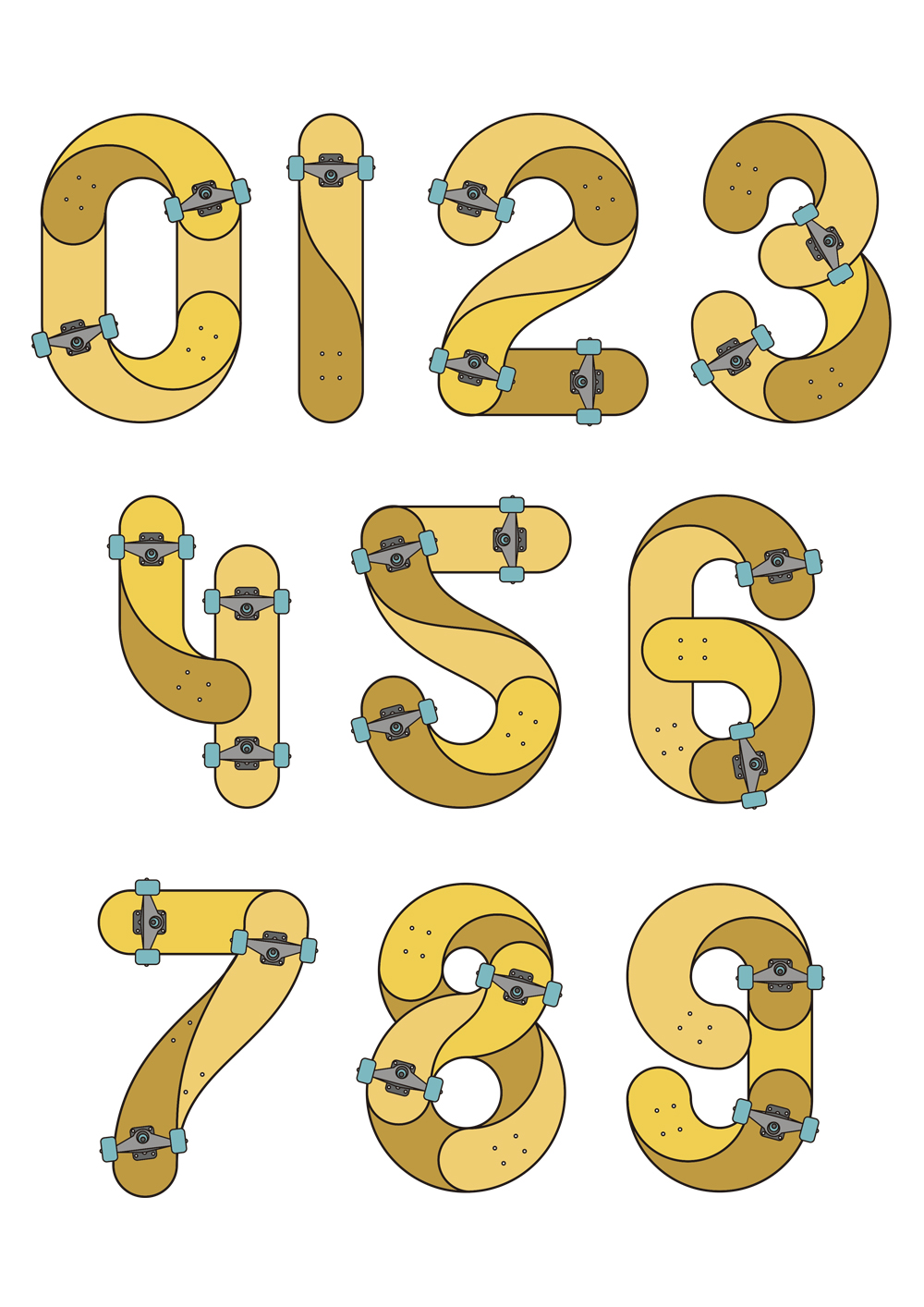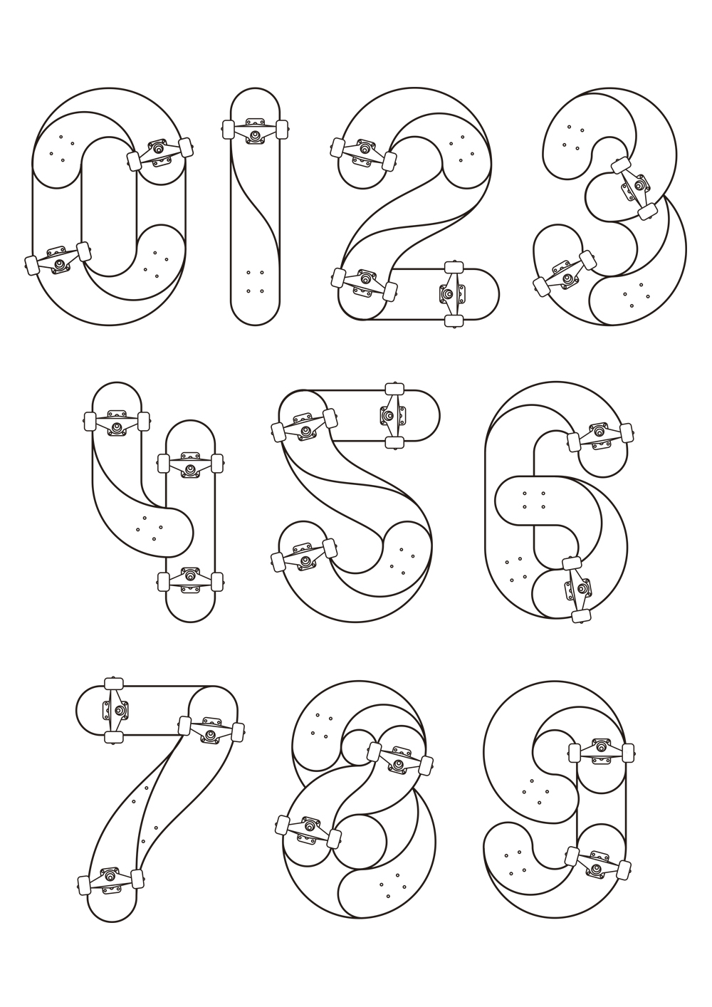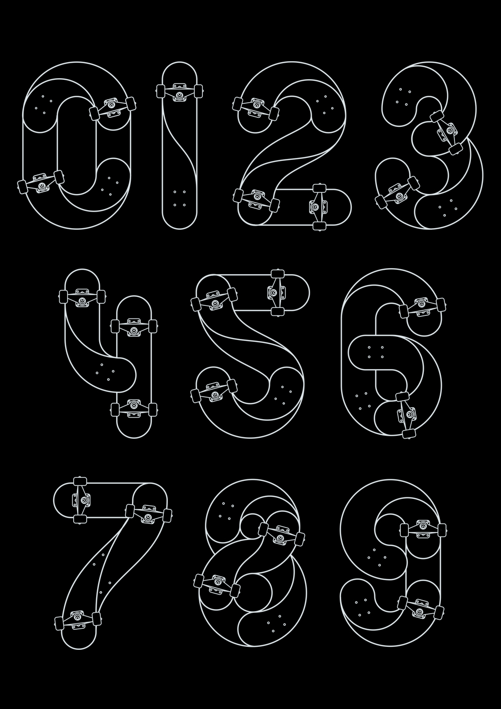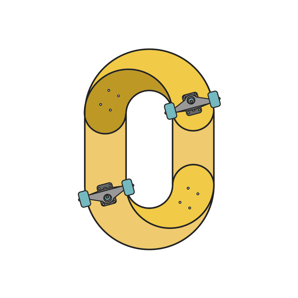 El primer truco está dentro del 0. El 1 se mueve en línea recta. El 2 vuelve a ser un truco en un patín. Estos dígitos, diseñados por Sergi Delgado, contienen giros y movimientos en una tabla de skate. “Intento que cada número represente un movimiento diferente y que, a la vez, recuerde a un truco”, indica el director de arte.