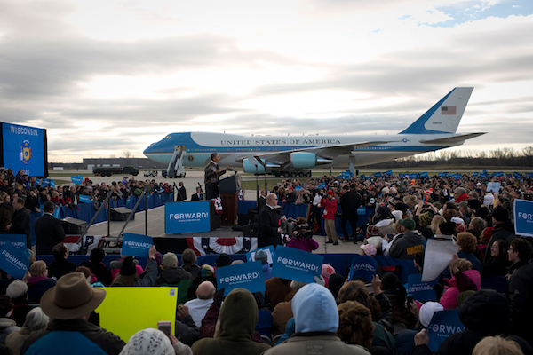 La campaña de Obama cuida más la fotografía y suele optar por fotografías profesionales. El presidente cuenta, además, con una ventaja que su rival no tiene, acceso a un 747 que aporta un cierto dramatismo a sus discursos…
