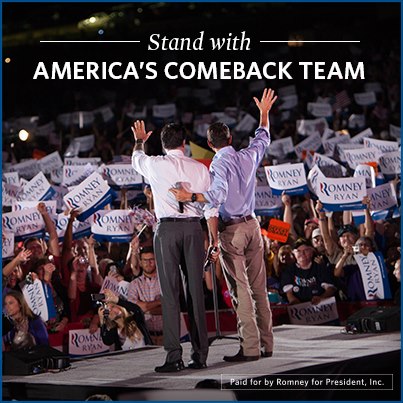 Mitt Romney acaba de superar los 12 millones de likes y su equipo ha realizado entre 3 y 6 actualizaciones diarias en los últimos meses de campaña. El diseño de su perfil en la red social es bastante sobrio y clásico, en línea con la personalidad e imagen que intenta transmitir.
