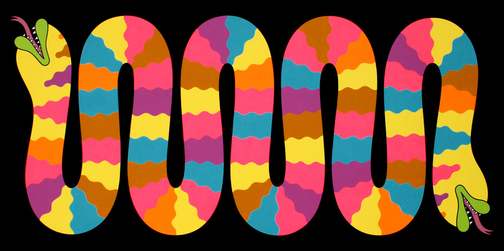 “Me encantan los colores planos brillantes”, dice el ilustrador. “Creo que los colores son más poderosos cuando están lo más saturados posible. Se sienten vivos. Golpean y gritan. También me gustan y utilizo blancos y negros para dar equilibrio y acentuar los volúmenes que marcan los contrastes”.