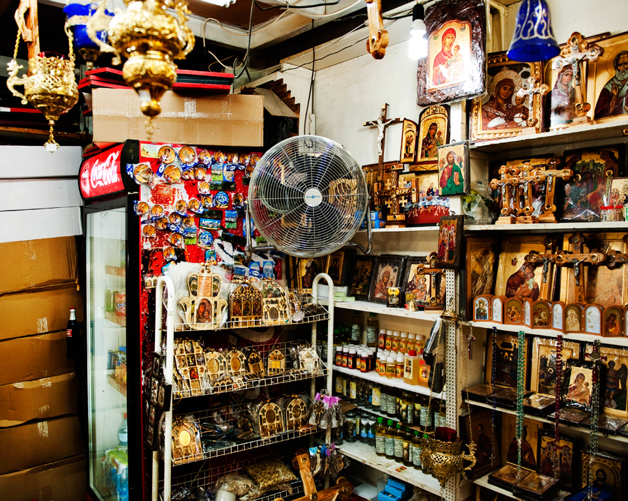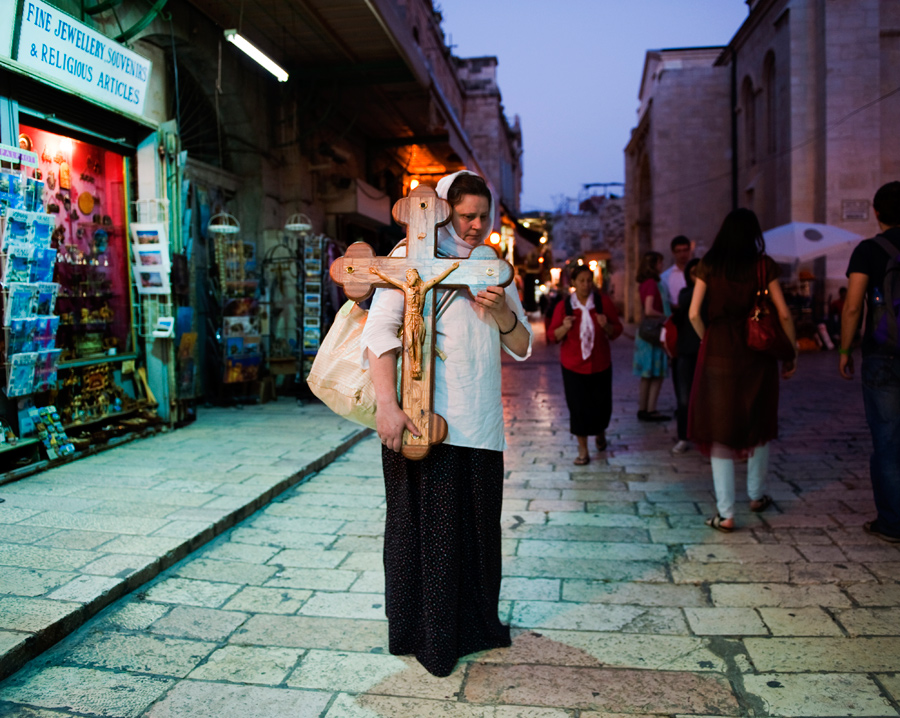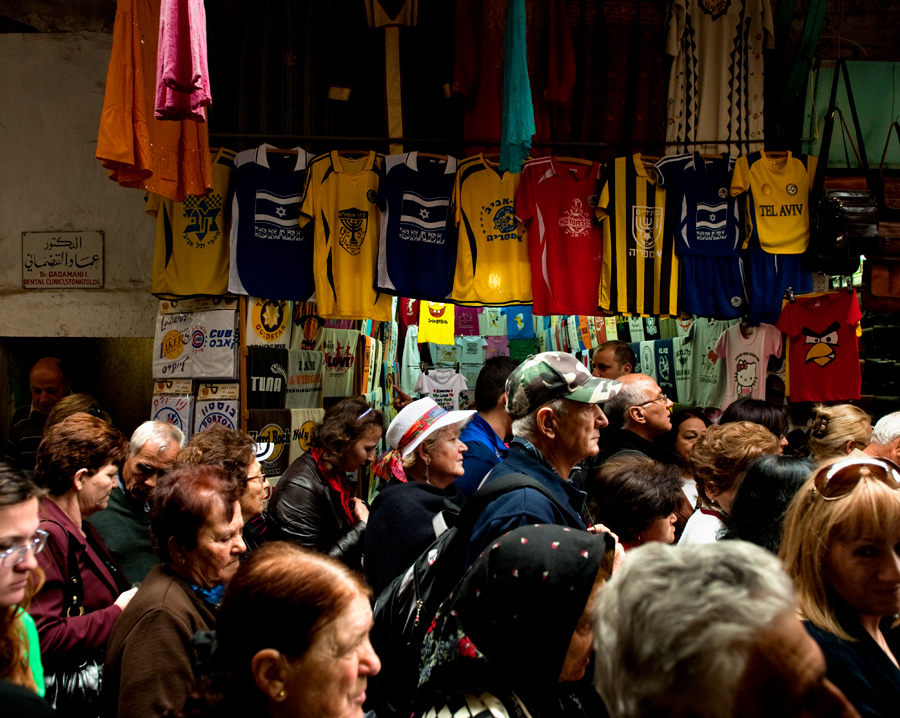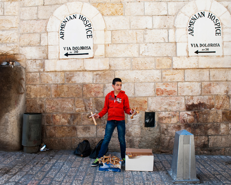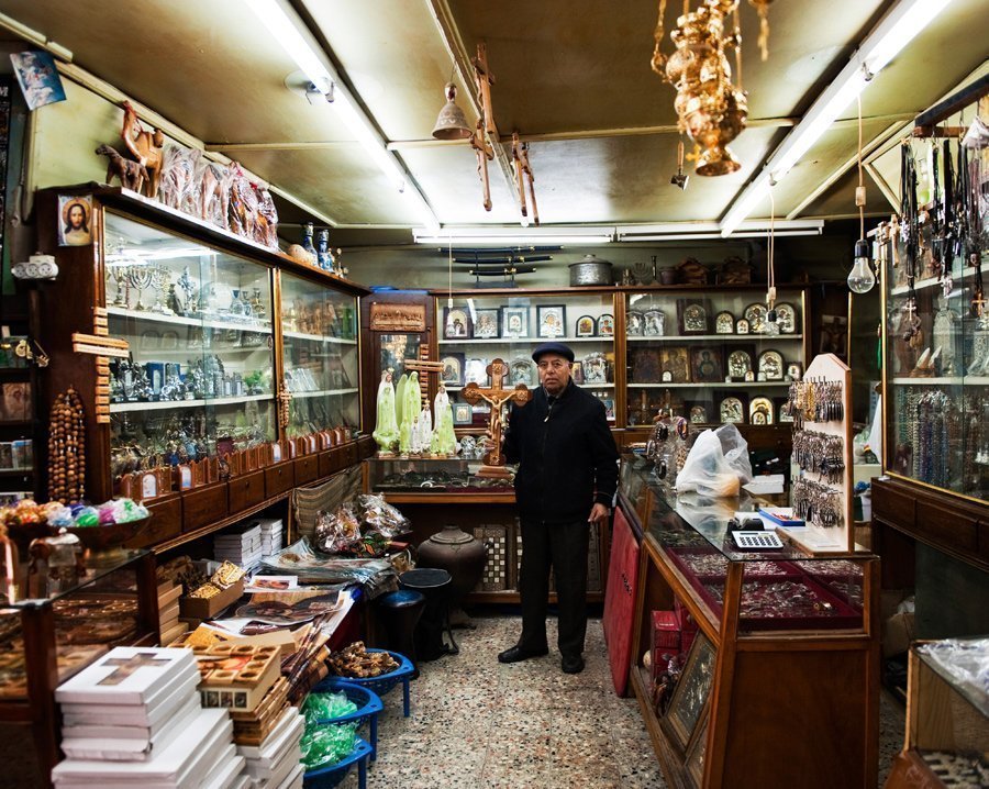La mayoría entendían la intención de mi trabajo y no tuve demasiados problemas para fotografiarlos. Casi todos hablan perfectamente el inglés e intentaron venderme alguno de sus productos. Son empresarios que miran por el bien de su negocio y no tienen reparo en colocar banderas palestinas al lado de souvenirs para judíos. Me decían que sus negocios están siendo muy afectados por la crisis económica y también por la gran competencia que sufren entre ellos. Me dio escalofríos cuando vi que en el centro histórico de Jerusalén hay más tiendas de souvenirs que en todo Salou, Gandía, Madrid y Barcelona juntas. Una clara señal del camino que están cogiendo las religiones.