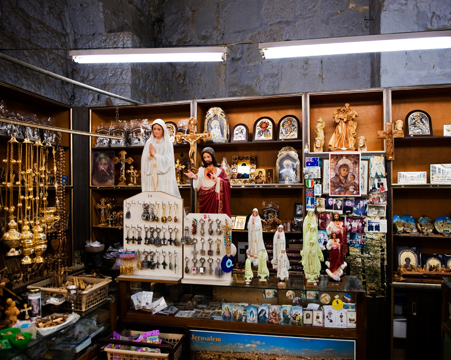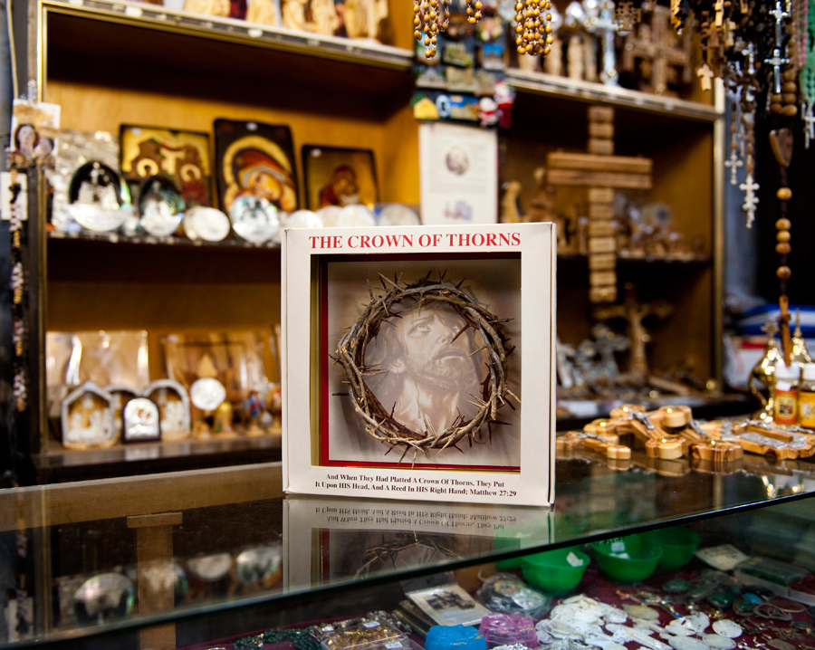 La facilidad con la que se mezclan los souvenirs en el interior de las tiendas es asombroso. En este campo es donde las religiones dejan ver su lado más moderno y creativo. Puedes encontrar de todo: las clásicas botellitas de agua bendita, cintas de video con los mejores momentos de alguna ceremonia, crucifijos de todos los tamaños y colores, ramitas de olivo, camisetas con la cara de la Virgen María del rollo heavy, coronas de espinas, bolsos de Jerusalén, cuernos de medio metro…