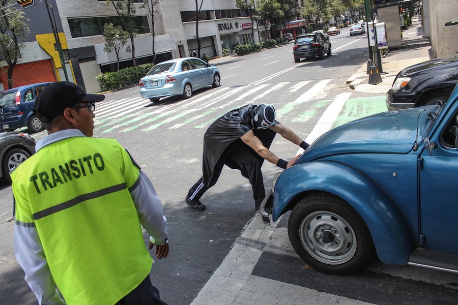 “Me inspiré en las acciones urbanas de Antonus Mockus durante su mandato como alcalde de Bogotá entre 1995 y 1997”. El académico, reconvertido en político, desplegó un ejército de mimos para reñir con humor a los conductores que rompían las normas o realizaban imprudencias. Poner en evidencia estas prácticas se consideró una medida más eficaz que apoyarse en la corrupta policía de tráfico, una situación con muchas similitudes con lo que acontece en esta ciudad actualmente.
