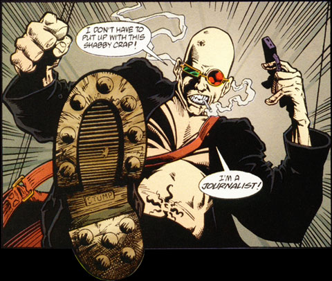 El bazuka y la patada en la puerta son cosas que haría Spider Jerusalem, el protagonista del cómic distópico Transmetropolitan. Este personaje creado por Warren Ellis lleva al extremo el periodismo gonzo creado por Hunter S. Thompson.