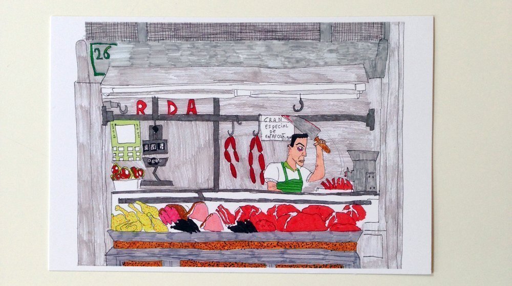 Los puestos se convirtieron en postales. Todas copian fielmente su tienda de origen excepto una carnicería donde Blázquez se ha metido en un cameo.