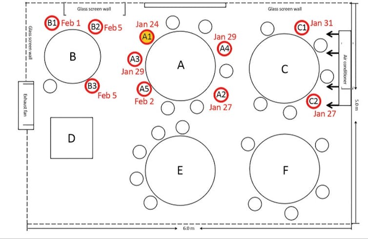 En la imagen un evento de superdispersión ocurrido en un restaurante en China. El espacio cerrado, unido al gran número de personas y el contacto cercano y continuado contribuyó a un brote de diez casos. El caso índice era asintomático y por tanto no era consciente de estar infectado. En este caso además la dirección del aire acondicionado contribuyó a la dispersión del virus y a incrementar las probabilidades de infección en determinadas zonas del establecimiento. Emerg Infect Dis . 2020 Apr 2;26(7). doi: 10.3201/eid2607.200764. https://wwwnc.cdc.gov/eid/article/26/7/20-0764_article