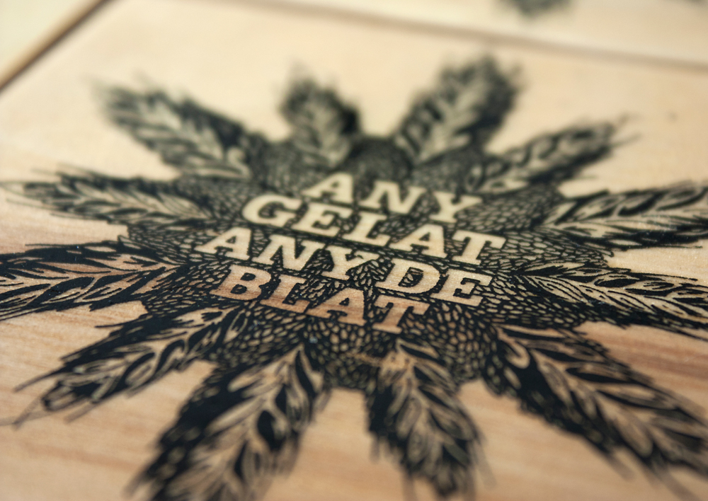 Pero hace un par de meses los miembros de este estudio rescataron algunas. Las trocearon ordenadamente con un cuttex siguiendo las medidas de un posavasos, las limaron e hicieron unas serigrafías con la frase: Any Gelat, Any de Blat (Año de nieves, año de bienes).