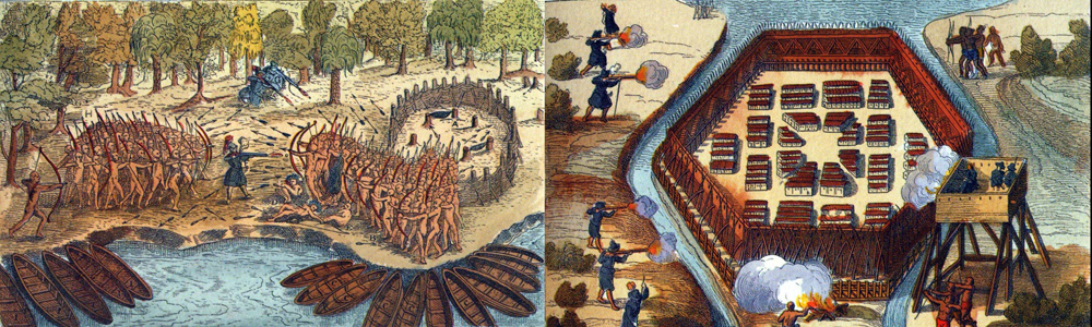 Entre las primeras referencias están las del fundador de Quebec, en 1608, Samuel de Champlain. Este realizó una excelente cartografía de la zona ya descubierta y dedicó un pequeño recuadro a los pobladores con los que él y sus hombres se habían visto envueltos, tanto en batalla como en relaciones comerciales. De las primeras dejó constancia en varios dibujos que luego fueron impresos como grabados. En uno muestra la típica organización y estructura de un poblado iroqués, con sus casas comunales en las que las mujeres, además de transmitir el apellido, escogían a los jefes, y donde todos los descendientes de un clan familiar eran hijos comunes.