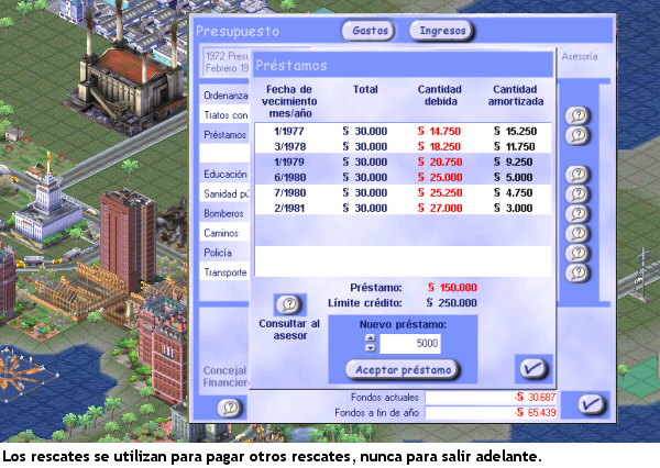 Me arriesgo a no escuchar al asesor financiero y pido un rescate económico. Con la inyección de capital apaciguo a funcionarios y ciudadanos por un tiempo. Pero los intereses son abusivos, y necesito otro rescate. (En este momento sé que el juego sigue los destinos de Grecia). El dinero de cada rescate es empleado en pagar los rescates anteriores. La Administración sigue paralizada, los impuestos siguen en la cota más alta y la economía decrece.