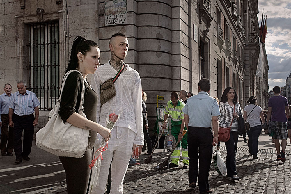 En Madrid, como en cualquier ciudad del mundo, las calles se construyen de gestos, miradas y conversaciones. Los individuos configuran el paisaje con sus ropas, sus posturas y las historias que cuentan sus rostros en un solo segundo. Kike Carbajal camina por las aceras buscando la fugacidad de esos semblantes y la actividad cotidiana sin maquillajes que apenas se documenta en los registros de un lugar.