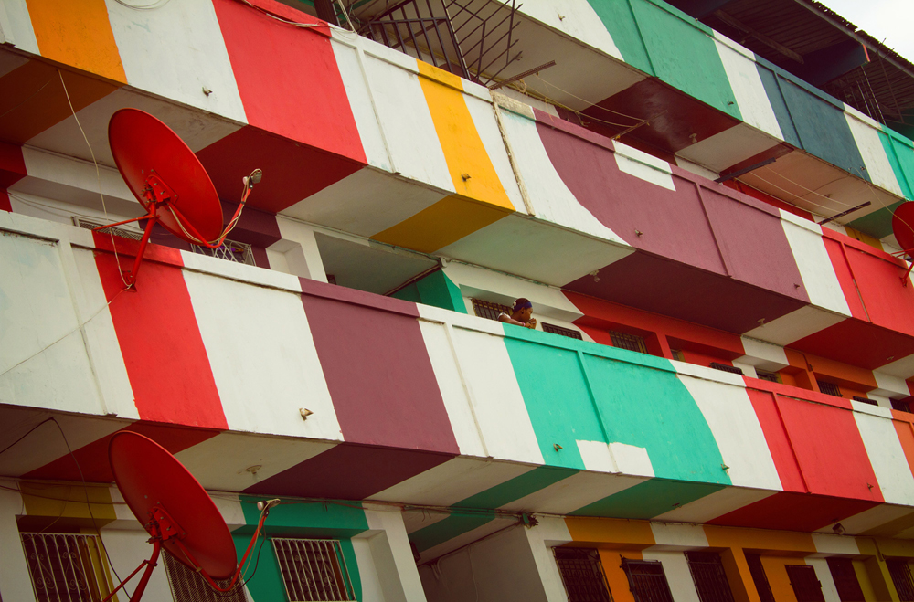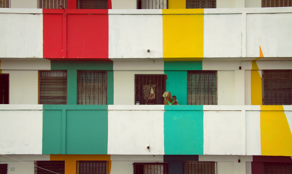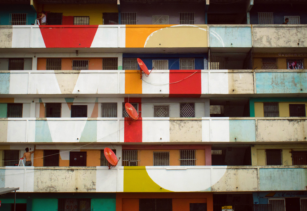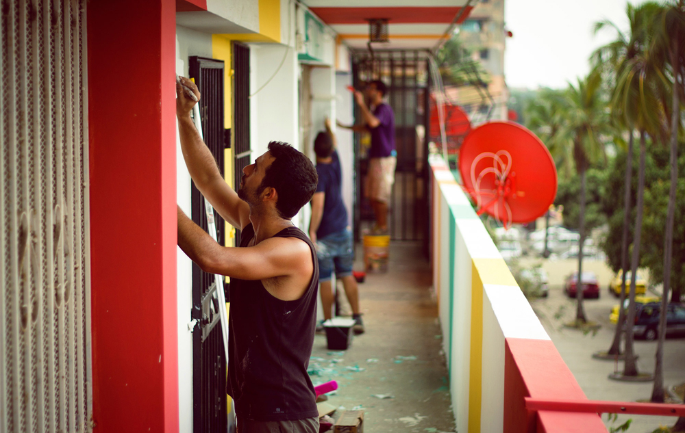 En esas tres semanas Boa Mistura hizo el marcaje de la pintura en un edificio de 50 viviendas llamado Begonia I. Después invitaron a los vecinos y, juntos, hicieron la intervención. “El proyecto parte de los colores tan saturados que utilizan en el Caribe. Pintamos con sus colores y pervertimos el patrón introduciendo tipografías”, explica. “En esa zona cada vecino pinta su casa de un color. Esta nueva estética, en cambio, tiene tres colores y eso exige que se pongan de acuerdo para pintar la porción de edificio que entiende como suya siguiendo el mismo estilo”.