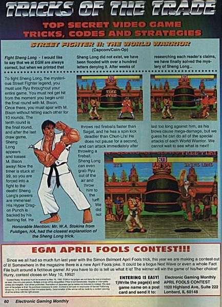 El juego tuvo además uno de esos casos de metarrealidad que asombran. El 1 de abril, el equivalente al día de los inocentes para la cultura anglosajona, de 1992, la revista Electronic Gamming Monthly publicó que el juego tenía un secreto escondido. La frase con la que Ryu, protagonista de la saga, celebraba sus victorias, advertía al rival de que debía derrotar primero a Sheng Long para tener alguna posibilidad contra él. La revista aseguraba que Sheng Long era su maestro y un personaje secreto. Para llegar a él, había que jugar con Ryu, llegar al malo final sin recibir un golpe y luego vencerle nueve veces seguidas. Si el jugador lograba semejante hazaña, el maestro hacía acto de presencia dispuesto a demostrar que todavía tenía mucho que enseñarle a su pupilo.