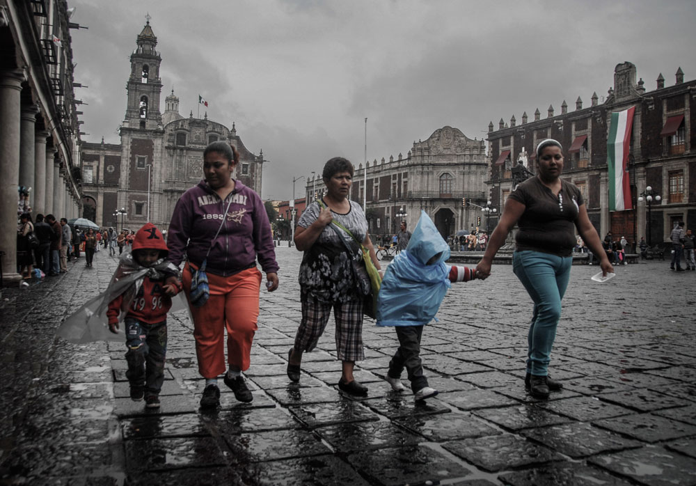Es época de lluvias. En la plaza la tormenta parece un aluvión de flechas. Pero bajo el soportal, este sábado de verano, a las seis de la tarde, quedan algunos mecanógrafos sentados en sus puestos, frente a su máquina, por si llega algún cliente. El paseo por la galería se interrumpe mil veces por alguien que se acerca a preguntar si quieres imprimir algo. “No”. Desaparecen.