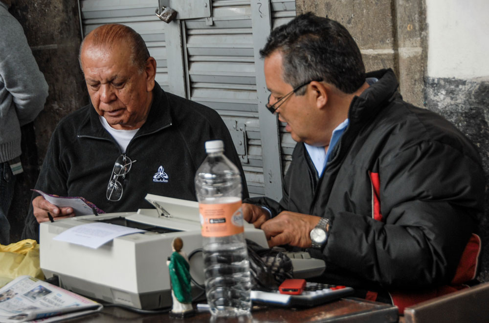 En los años 70 y 80 llegaron las máquinas de escribir electrónicas a las oficinas. También, al portal. Muy poco después los ordenadores volvieron autistas a estos aparatos. La conexión digital cambió las oficinas, la comunicación y el mundo entero. La plaza de Santo Domingo se congeló en el tiempo. Las aceras no tienen enchufes y los mecanógrafos se resistieron al ordenador. “Muchos de nosotros somos analfabetos de computadoras”, confiesa el secretario. Él aprendió su oficio en la “Universidad de Santo Domingo”, dice. Y ante la cara de perplejidad de la periodista, aclara: “la universidad de la vida”. “Aquí fui aprendiendo todo. Yo era bastante ignorante pero acá todos aprendemos de todos”, continúa. “Y en los ratos que no estamos trabajando leemos noticias y literatura. El tipo de lectura y el interés por seguir aprendiendo depende ya de cada uno”.
