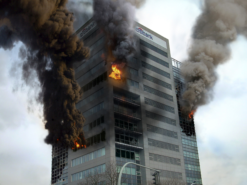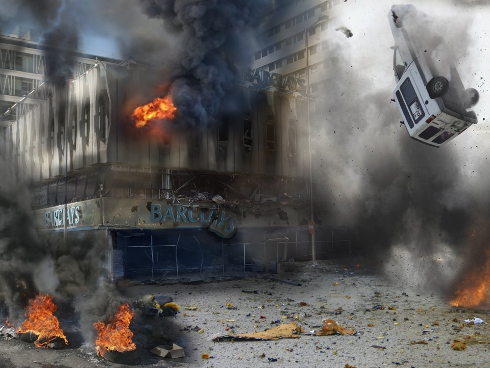 Neumáticos incendiados, columnas de humo saliendo de las ventanas del edificio del Banco Barclays en Madrid, furgonetas volando por la deflagración de un potente explosivo en la plaza de Colón… No son las imágenes de un atentado, sino las fotos subversivas del artista Manuel Rufo, un proyecto que nació como ajuste de cuentas y se fraguó con un objetivo: quemar y destruir (simbólicamente, se entiende) algunas sedes de los 20 mayores bancos del mundo.