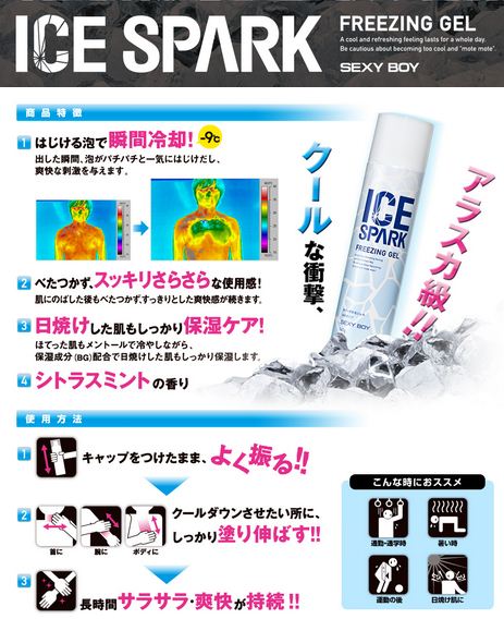 El producto Ice Spark de la marca Sexy Boy es una espuma que produce un efecto refrigerante al aplicarlo a TODO el cuerpo. Lo he incluido sobre todo por las imágenes que en su web ilustran su utilización y sus propiedades. Realmente parece que los diseñadores gráficos estén pensando en que frikis occidentales que no hablan y sobre todo no leen ni una letra de japonés van a entrar a sus webs a husmear por los callejones más angostos de su cultura.