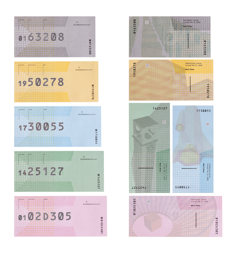 “The Goote Project es un proyecto de diseño gráfico con carácter experimental y de investigación”, aclara el autor desde el principio, “con el objetivo de desarrollar el concepto, gráfica y funcionalidad de la moneda oficial de un Estado irreal enmarcado en contexto de dos novelas distópicas: Мы, de Yevgueni Zamyatin, y 1984”. Mientras que de la primera, un texto de 1921 sobre una clase dirigente que oprime y reprime a todas las demás mediante la policía secreta, toma “las referencias estéticas -muy influenciadas por el Constructivismo-, los nombres de los personajes, conductas sociales, arquitectura, estética formal y concepto de estado”, de la segunda asume “el nombre del Estado y sus instituciones, localización, métodos de control y lenguaje”.