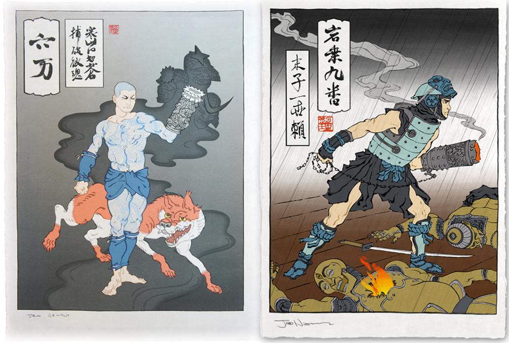 Vamos por partes, como dijo el descuartizador. El ukiyo-e es una técnica japonesa de estampación en madera que floreció en las clases urbanas japoneses del periodo Edo. Destinado a un consumo masivo, se utilizó para realizar ilustraciones, carteles hechos a mano para anunciar teatros, promociones de casas de geishas e incluso una suerte de postales primitivas. Cuando se combina este arte japonés con la nueva gran contribución popular nipona a la cultura en el último siglo, los videojuegos, salen los Ukiyo-e Heroes del ilustrador Jed Henry y el especialista en grabado japonés Dave Bull.